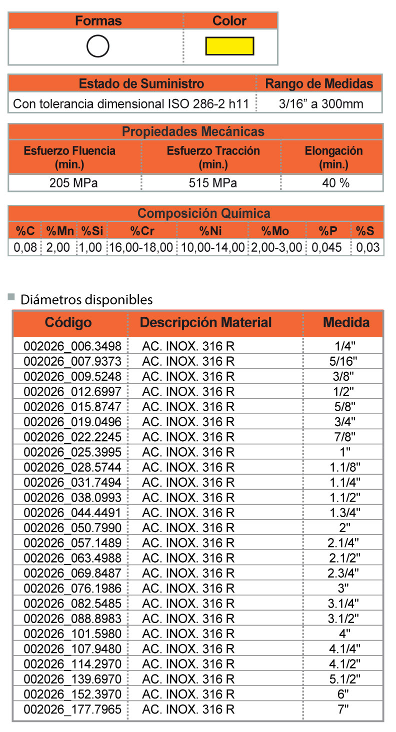 Aplicaciones Generales: El acero AISI 316 es utilizado en la construcción de piezas y elementos estructurales de la industria alimenticia, celulosa, minera, química, farmacéutica y petroquímica. Algunas aplicaciones específicas son: ejes de hélices, acoples y equipos hospitalarios.